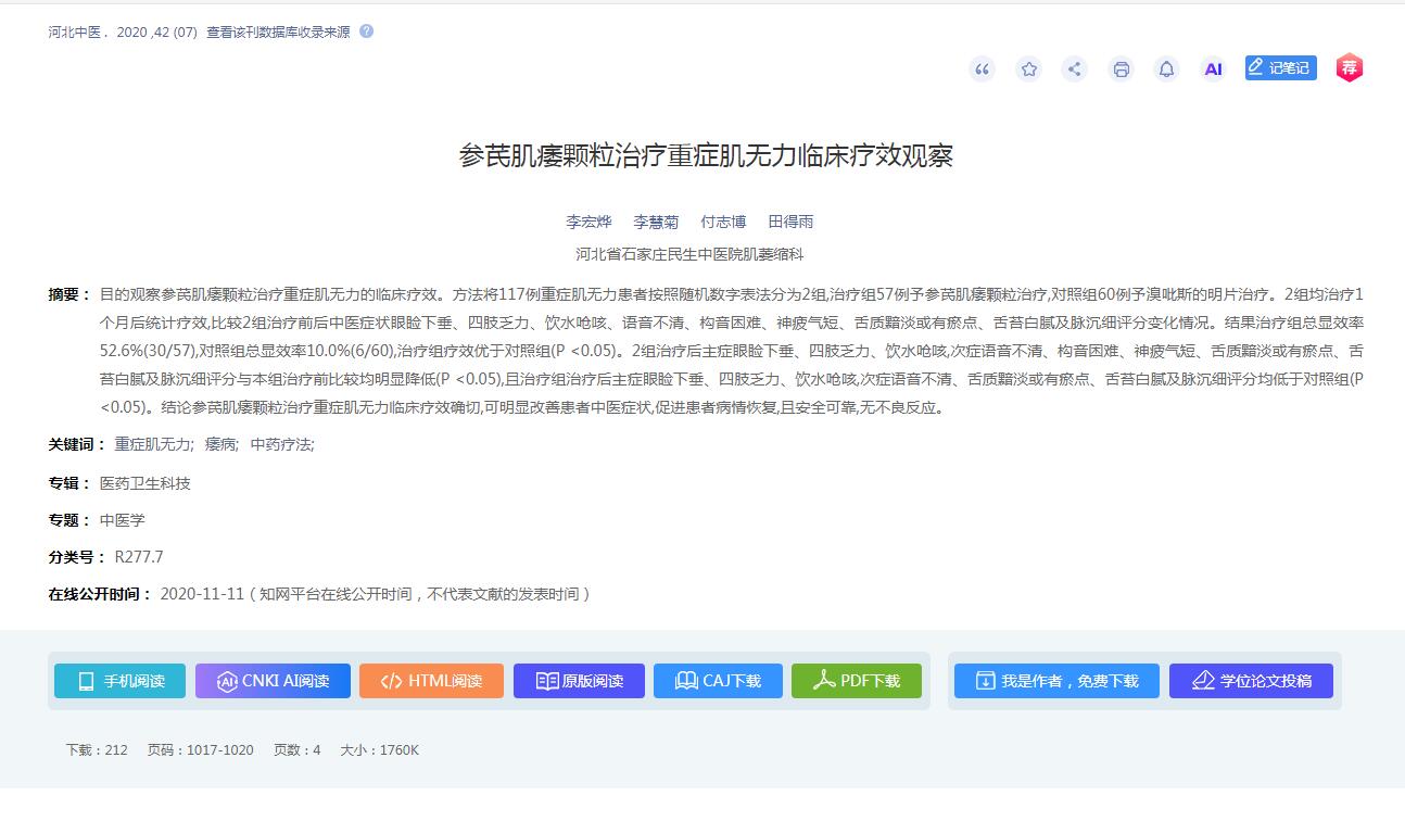 2020年7月我院医师李宏烨、李慧菊、付志博、田得雨成功在《河北中医》杂志上,发表论文《参芪肌痿颗粒治疗重症肌无力临床疗效观察》。
